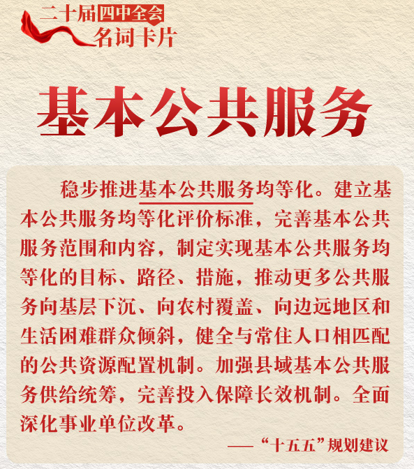 ??四是加大基本公共服務(wù)保障力度。強化基本公共服務(wù)中央事權(quán)和支出責任,合理提高基本公共服務(wù)支出占財政支出比重,構(gòu)建多元供給格局,完善基本公共服務(wù)均等化投入保障長效機制。(據(jù)《黨的二十屆四中全會<建議>學習輔導(dǎo)百問》)