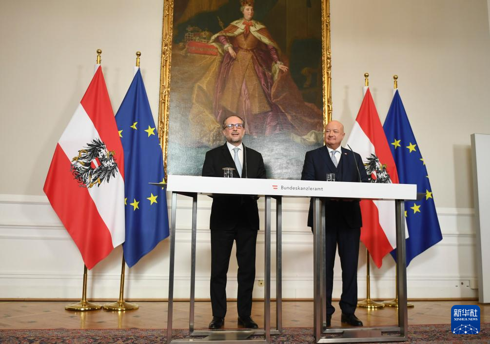 3月3日,在奧地利維也納,奧地利看守政府總理沙倫貝格(左)在總理府和奧地利人民黨黨首克里斯蒂安·施托克爾進行權(quán)力交接。