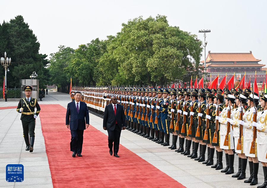 ??恩巴洛抵達(dá)時(shí),禮兵列隊(duì)致敬。兩國(guó)元首登上檢閱臺(tái),軍樂團(tuán)奏中國(guó)和幾內(nèi)亞比紹兩國(guó)國(guó)歌,天安門廣場(chǎng)鳴放21響禮炮。恩巴洛在習(xí)近平陪同下檢閱中國(guó)人民解放軍儀仗隊(duì),并觀看分列式。